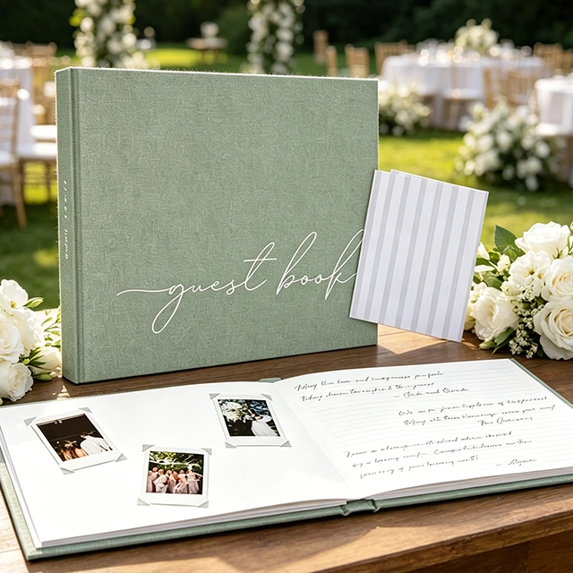 Unlike digital files that can be lost or corrupted, a well-crafted guest book is a physical heirloom that can be passed down to children or grandchildren. The sage green cover’s timeless design ensures it won’t look dated in 20 or 50 years, making it a piece of your family’s history. Many couples even choose to display the book on their coffee table as a conversation piece, keeping their wedding story alive in their home.